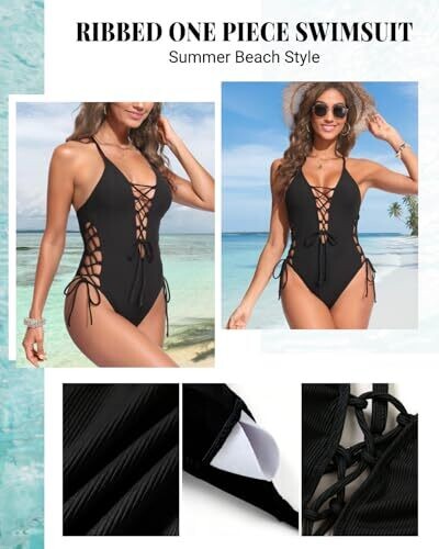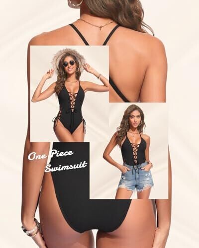 Tempt Me offers a bold black one-piece swimsuit with lace-up sides, a deep V-neck plunge and open back. The high-cut bottom elongates the legs, while breathable, smooth fabric and a secure cut keep you confident at the pool or beach.