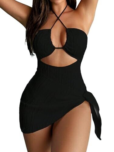 - Womens One Piece Swimsuit Solid Color Texture Hollow Out Halter Neck Bathing Suit for Women with Cover-Up 2-Piece Set, Black, Medium – a chic, confidence-boosting ocean-ready look.