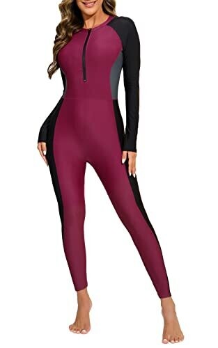 • Alltoke Women Front Zipper One Piece Swimsuit Long Sleeve Long Pants Built In Bra UPF 50+, Burgundy+Black+Grey, 2Xl