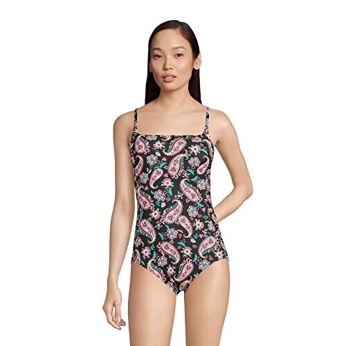 Lands' End Women's Chlorine Resistant Smocked Square-Neck Swimsuit, Black Multi Paisley Floral, X-Small