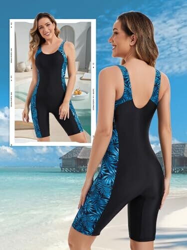 The swimsuit is a sleeveless one-piece designed for women, available in black. It is made of 82% polyester and 18% elastane, providing stretch and durability with breathable fabric for all-day comfort. The design features a tank-top style with a V-back and U-neckline, a boyleg cut, and removable padded cups for shaping and support. A tummy-control panel helps create a smooth silhouette without restricting movement. It is suitable for various water activities including lap swimming, beach days, surfing, paddleboarding, kayaking, and aqua fitness. Available in five sizes: