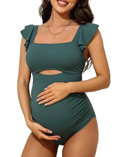 Charmo Ruffle Maternity Swimsuit Ribbed Tie Knot Cutout Ruched Pregnancy Swimwear, Green, L