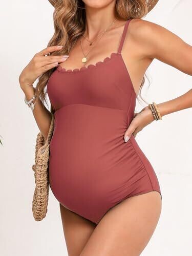 • Cupshe Maternity One Piece Swimsuit Scoop Neck Scalloped Lace-Up Back Criss-Cross Tie Pregnancy, Brown