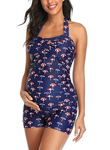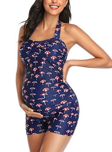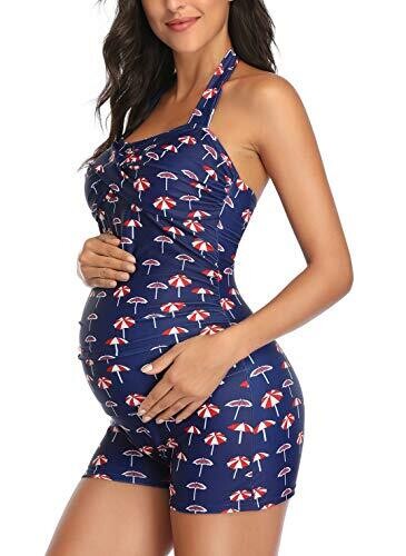 Eastelegant Maternity One Piece Swimwear Retro Halter Swimsuit with Boyleg Bathing Suit, Umbrella, Large