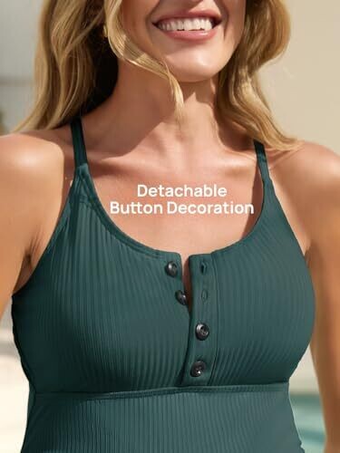 Detachable neck buttons and nursing-friendly design offer convenience. Cross-back straps provide adjustable support and a flattering silhouette. Ruched sides and tummy control help with a comfortable fit during pregnancy in a fully lined, quick-drying green maternity swimsuit.