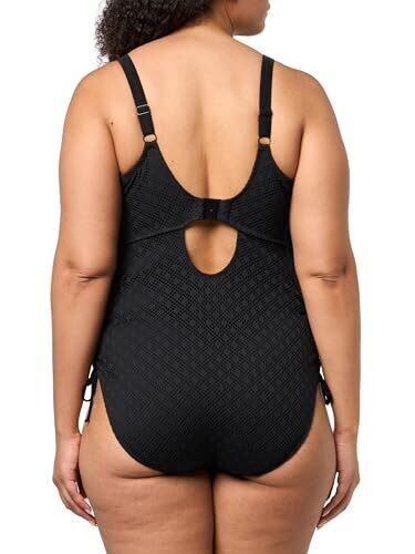 Elomi Bazaruto Plunge Non Wire One Piece Swimsuit in sleek black offers comfortable support with a chic plunge neckline. Non-wire design, soft lining, textured crochet detailing, adjustable shoulder straps, and side ties for a tailored, flattering fit at the beach or pool.