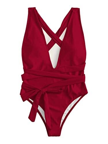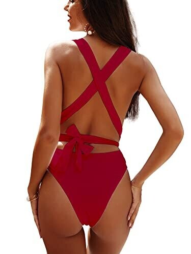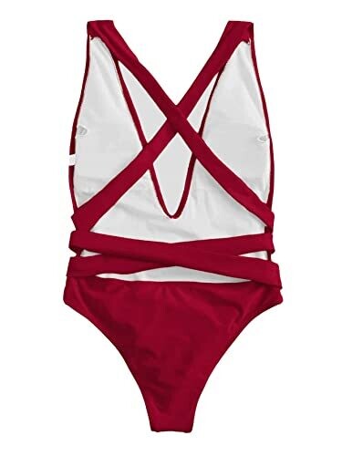 • Lilosy Sexy Tie Criss Cross Plunge One Piece Thong Swimsuit High Cut Brazilian Bathing Suit, Red