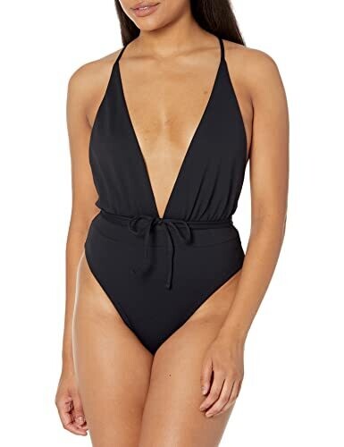 Shade & Shore Women's Plunge Flounce Neckline One Piece Swimsuit -, Black, X-Large