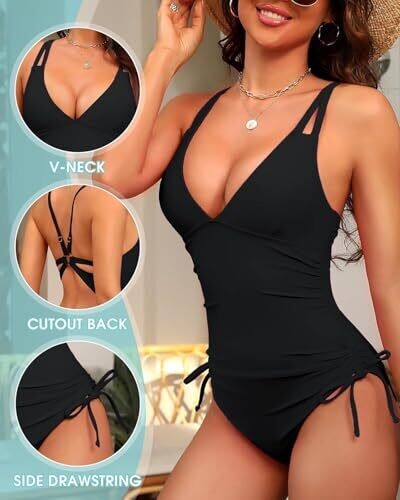 Maiableau Deep V Neck One Piece Swimsuit Keyhole Cutout Drawstring Black L