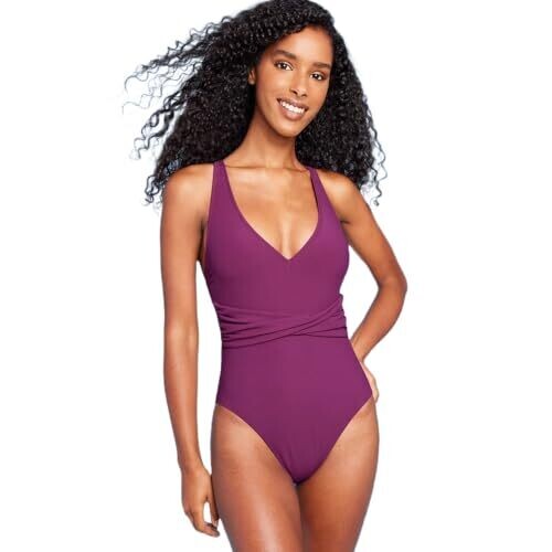 • Shade & Shore Women's Ribbed Plunge Twist-Front One Piece Swimsuit -, Large, Purple