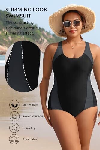 - Full-coverage one piece with a trendy color-block design that flatters every silhouette.