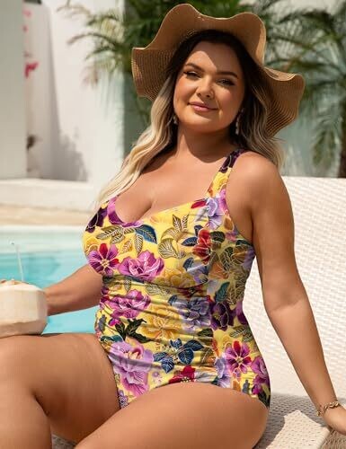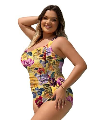 Floral retro-inspired one piece that flatters curves with tummy control. Adjustable straps, built-in padding, and abdominal pleats create a smooth, secure silhouette. Full-coverage high-waist design offers confident comfort in plus sizes with breathable stretch fabric.