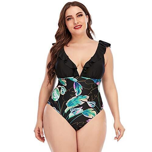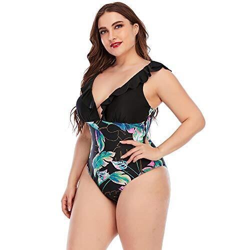 Halo Aqua Plus Size V Neck One Piece Swimsuit Monokini Ruffles (Black, XL)