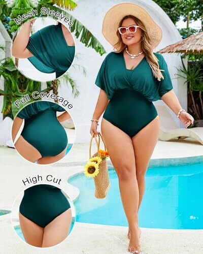 • Jolefille Plus-Size Swimsuit for Women Tummy Control Mesh-Sleeves (X-Large)