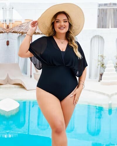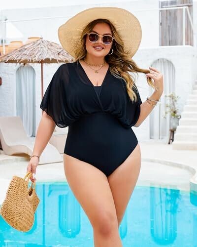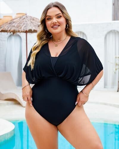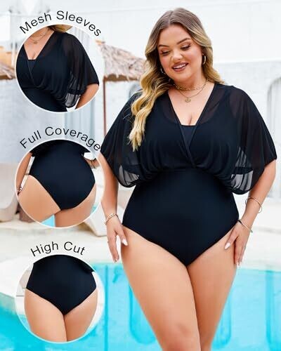 Jolefille Swimsuit for Women Modest Tummy Control Mesh Sleeve Black, X-Large