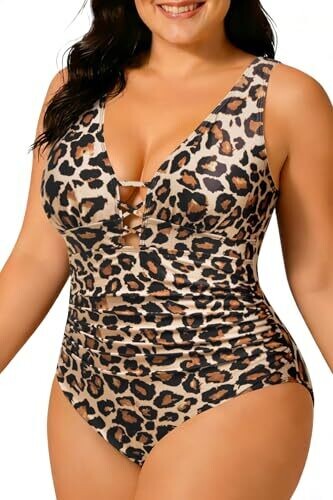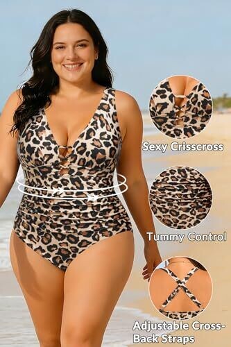 Flattering tummy control and ruching define the waist for a slimmer silhouette. Leopard print with a lace-up front and criss-cross back creates standout style. Deep V-neck, stretchy fabric, and comfortable fit make it ideal for beach getaways.