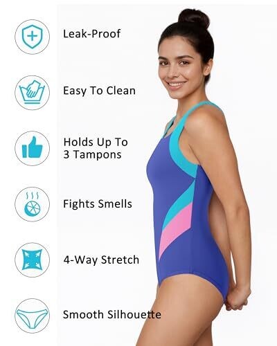 - Stay stylish and confident during your period with this color-block athletic swimsuit.