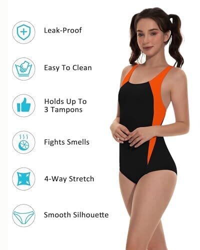 Beautikini Swimwear One Piece Leakproof Racerback Swimsuit, Black/Orange Small