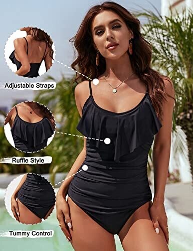 • Blooming Jelly Women's Swimsuit Ruffle Tummy Control Swimwear, Black, X-Large
