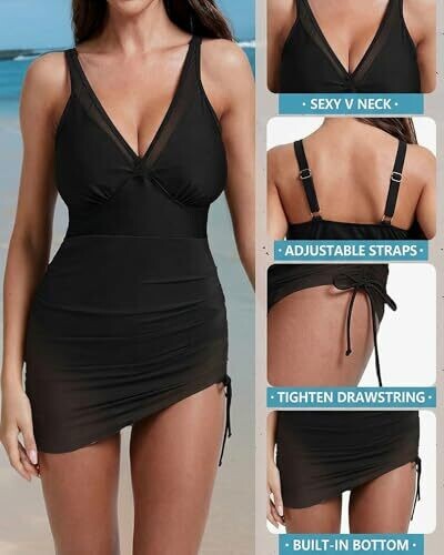 • Simlakey Women One Piece Swim Dress Mesh Tummy Control Swimsuit Straps, Black