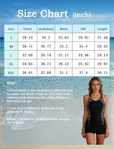 The product is a women's one-piece swimsuit designed for tummy control with a modest boyleg cut. It is navy blue in color and available in X-Large size. The package includes 1 piece swimsuit. Features include sleeveless design, crew neck, chest pads, and a tank top style with a classic U-back. The suit is described as having a tropical abstract print on the sides and a slim fit. It is suitable for activities such as beach, pool, and watersports, and provides UPF 50+ protection. Fabric is described as superior, soft, lightweight, and stretchy with 4-way stretch, close fitting to the body, and resistant to deformation, fading, or shrinking after washing.