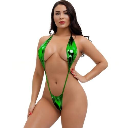 Sexy Mini Monokini Swimwear for Women Pu Leather One-Piece Halter Extreme Micro Bikini Teddy Lingerie Swimsuit (AU, Alpha, One Size, Regular, Regular, Gold)