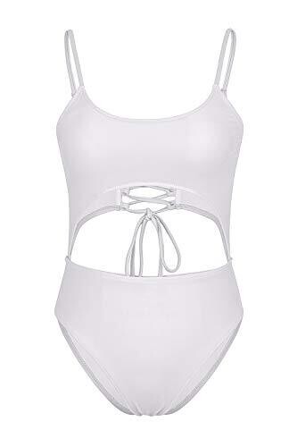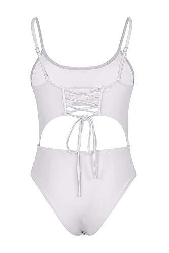 Meyeeka Scoop Neck Cut Out Front Lace Up Back Monokini Swimsuit (White, Small)