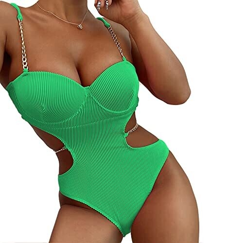 • Yauasopa Women's Cutout Metal Chain Bikini Ribbed Swimsuit, Green, Medium