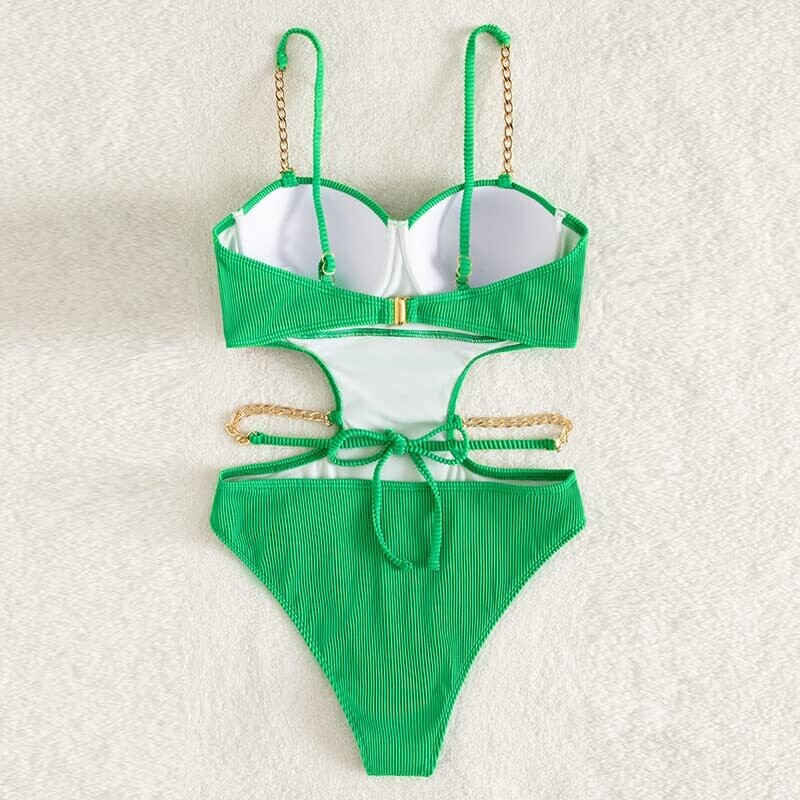 Sexy cutout bikini with metal chain straps and ribbed texture for a bold, modern look. Vibrant green one-piece that elongates the legs with a cheeky high-cut bottom and flirtatious knot detail; versatile beachwear for poolside to sunlit adventures.