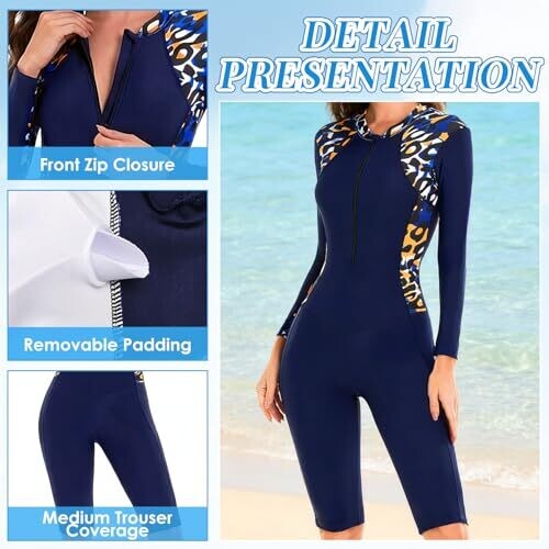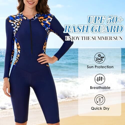 UPF 50+ sun protection for all-day beach and water activities. Built-in removable bra cups for light support. Front zip for easy on/off and ventilation. Boyleg knee-length cut for full coverage. Quick-dry, soft, breathable fabric suitable for swimming, surfing, diving, snorkeling.
