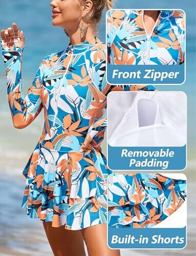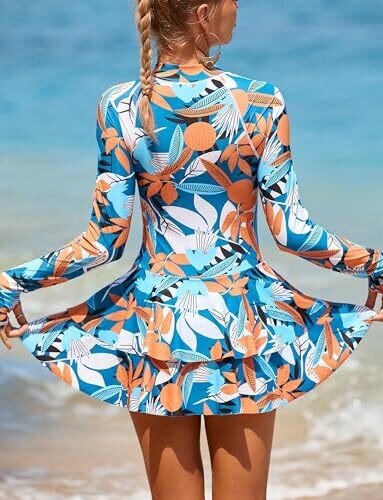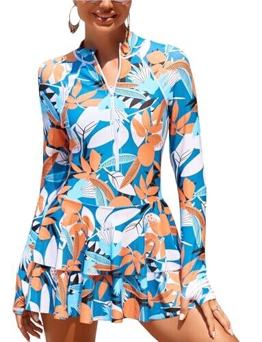 Elevate your beach look with a vibrant orange printed long-sleeve one-piece. Modest design with a front zip for easy wear and a flattering silhouette. Built-in sun protection and removable bra, soft quick-drying fabric for all-day comfort.