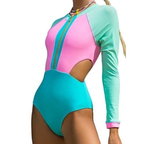 • Yudibyw Women One Piece Monokini Tummy Control Zip Front Cutout Sleeve Swimwear
