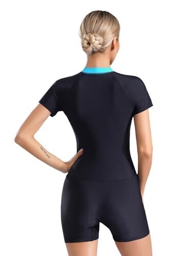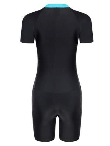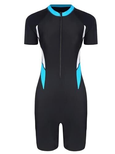 This lake-blue, color-blocked athletic one-piece features a front zipper with zip guard for secure wear. It offers UPF 50+ sun protection, breathable mesh lining, removable pads, and short sleeves for comfort during swimming, surfing, and water park adventures.