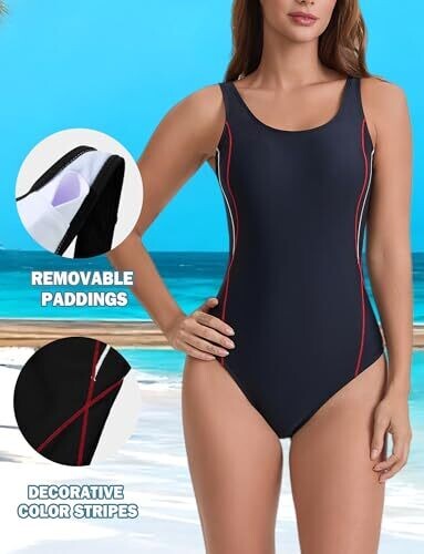 Seaur Women's Athletic One Piece Swimsuit Chlorine Resistant Lap Swimming Costume, Sleeveless U Back High Cut Padded Bathing Suit, Black + Blue Line, M
