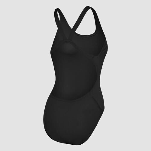 Speedo women's Endurance+ Leaderback One Piece swimsuit in black, size 8. Built for chlorinated water, it offers durable fabric and a comfortable leaderback strap for freedom of movement and a sleek, secure fit.