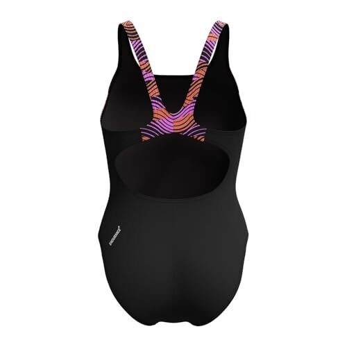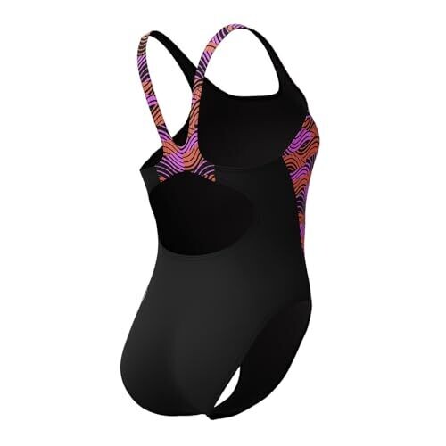 A new HyperBoom print iteration is used, featuring splices of the HyperBoom design. The swimsuit has a sport-specific muscleback cut for freedom of movement. It is made with Endurance+ fabric, which is quick-drying and designed for durability with high chlorine resistance.