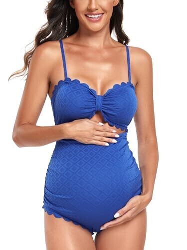 - Embrace your pregnancy with EastElegant's maternity one-piece featuring a flattering back cutout and scalloped trim for stylish confidence at the beach.