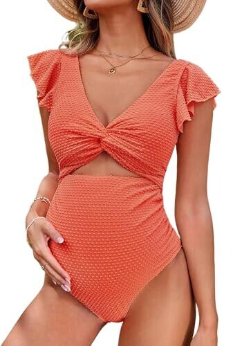 Experience comfort and style with a vibrant orange maternity one-piece featuring a V-neck front twist and soft ruffle accents. Removable padding offers optional shaping, while the front cutout and twist design enhance mobility for beach days, pools, and maternity shoots.