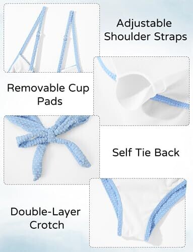 Adjustable shoulder straps; self-tie back for a secure, customizable fit; removable cup pads for flexible support; double-layer crotch for durability and comfort; soft, stretchy and breathable fabric made of 90% polyester and 10% elastane.