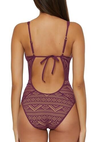 Becca Color Play One Piece Swimsuit, Plunge Neck, Crochet, Bathing Suit, Aubergine (A), Large