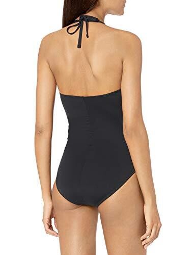 Marketing-optimized plunge silhouette with chic mesh accents for a standout look. Mesh cut-outs and metallic rings deliver a vogue vibe while remaining stylish. Adjustable halter neck, removable cups, built-in tummy toner, and a classic one-piece cut that flatters natural curves.