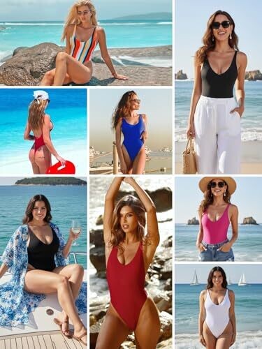 Plunging neckline, removable padding, no underwire, tummy control and high-cut design; shoulder straps are adjustable; low-cut back with minimal back coverage; double-lined comfort for a silky swimming experience; can be worn as a bodysuit and styled with skirts or jeans for outfits; suitable for tropical vacations, summer, beach and pool, honeymoons, and cruises; metal logo acts as an anti-counterfeit label to ensure product quality.