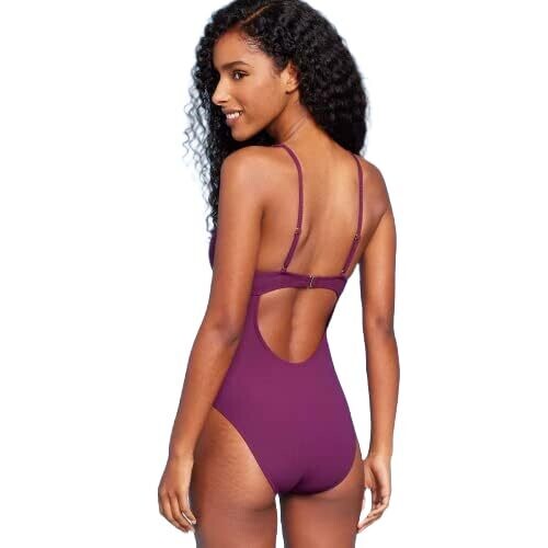 Flattering ribbed fabric with a plunge twist-front for a chic, confident poolside look. Vibrant purple shade with removable cups for adjustable shaping. Back hook closure and one-piece silhouette blend style and comfort for lounging or swimming.