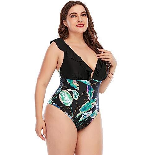 Halo Aqua Plus Size V Neck One Piece Swimsuit Monokini Ruffles (Black, XL)
