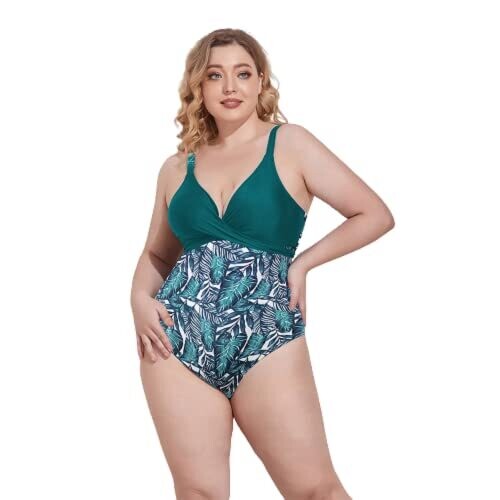 Bold two-tone design in vibrant green with a flattering cross-front and tie-back silhouette. Plus-size friendly fit that smooths and supports, plus all-day comfort from stretch nylon-elastane. Ideal for swimming, beach parties, vacations, and poolside lounging.