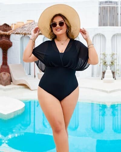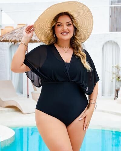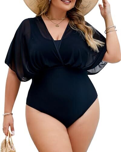 Jolefille Swimsuit for Women Modest Tummy Control Mesh Sleeve Black, X-Large