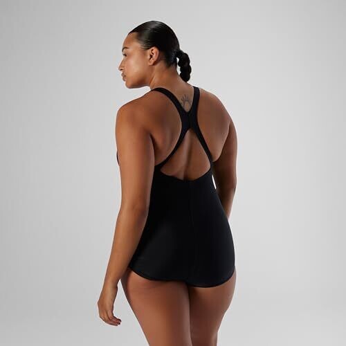 - Bold Black Speedo one-piece designed for plus-size comfort and confidence in the pool.