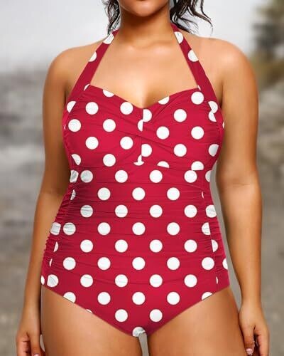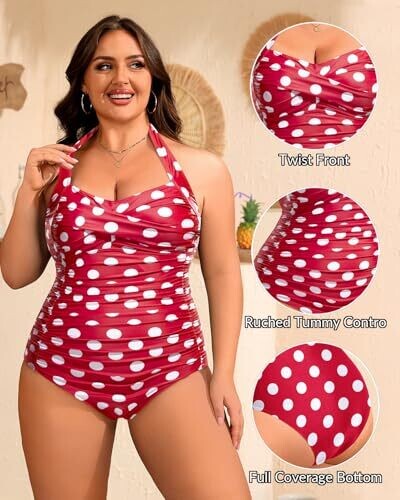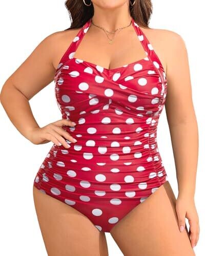 Yonique Plus Size One Piece Swimsuit Tummy Control Halter (Red Dot, 22)
