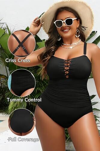 Sleek plus-size one-piece with a deep V-neck and tummy control for a flattering silhouette. Lace-up front with ruched detailing and removable padded bra for lift. Adjustable straps and criss-cross back for a secure, customizable fit. Soft, quick-drying fabric in black.