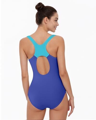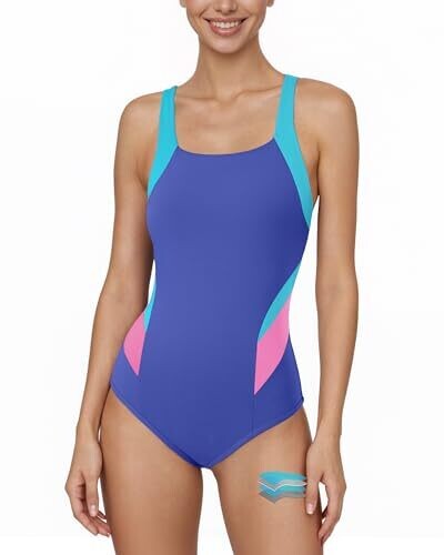 Beautikini Period Swimwear One Piece Leakproof Racerback Swimsuit, Bright Blue/Purple Rose/Waterfall, Medium